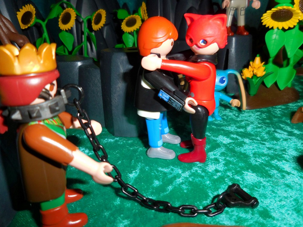 Sie springen zu Boden. Catty lässt das Kettenende fallen und umarmt