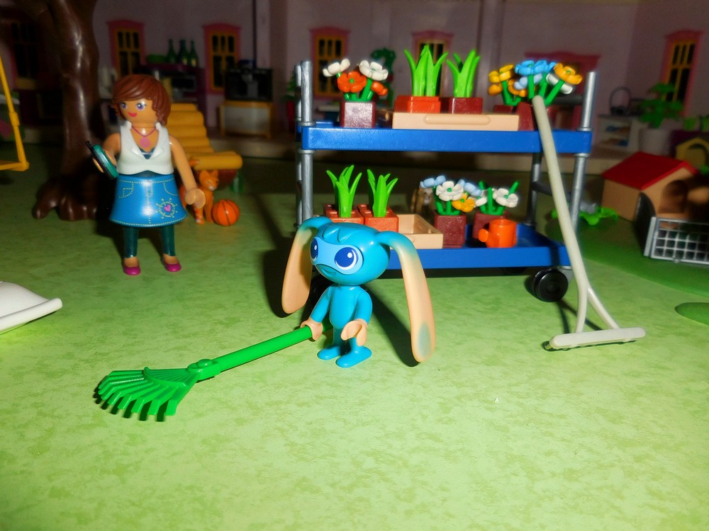 Dann greift es nach dem Rechen und versucht, mir bei der Gartenarbeit