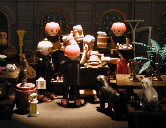 Sie schlug dem Geist vor, die Mönche zu überreden, sich öfter als Gespenster zu verkleiden, dann fiele eins mehr überhaupt nicht auf. „Das wäre Klasse!“, freute sich das Gespenst und umarmte das Fräulein. Als Ritterlinchen in den Bierkeller kam und sich zu den feiernden Klosterbrüdern setzte, schlug sie ihnen vor, jede Nacht, zumindest für eine Stunde, mit weißen Tüchern im Kloster herumzugeistern. Das würde sich herumsprechen, und mit der Zeit wäre das Kloster vor Ueberfällen sicher.