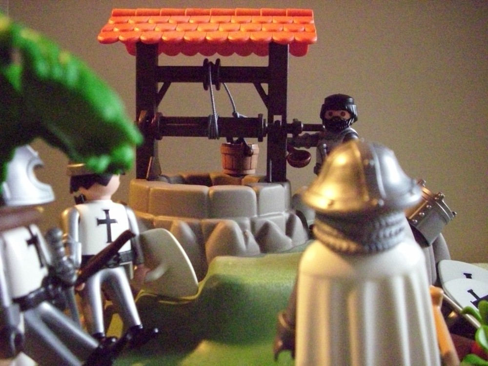 ,, Erlaubt mir mich euch vorzustellen , mein Name ist Bruder Gabriel und ich bitte euch , lasst meine Leute und mich dort am Brunnen kurz Rasten und etwas Erfrischen . Wir werden euch bestimmt nichts tun ," erklärte der Anführer der Fremden .