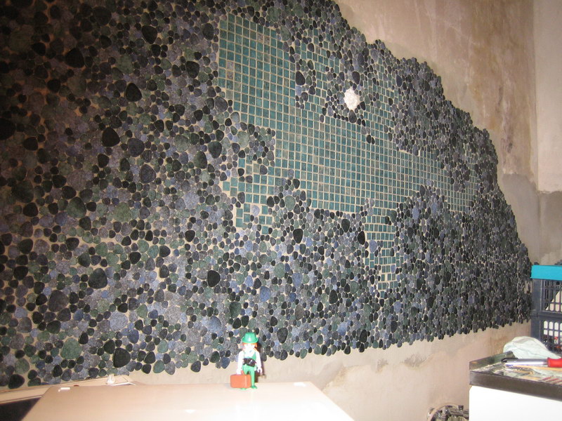 Und nach Verputzen der Wand begann das Puzzlespiel: einen selbstentworfenen Gekko in Kieselmosaik an die Wand zu verlegen. Dank Felix´ Hilfe wurden wir heute damit fertig.