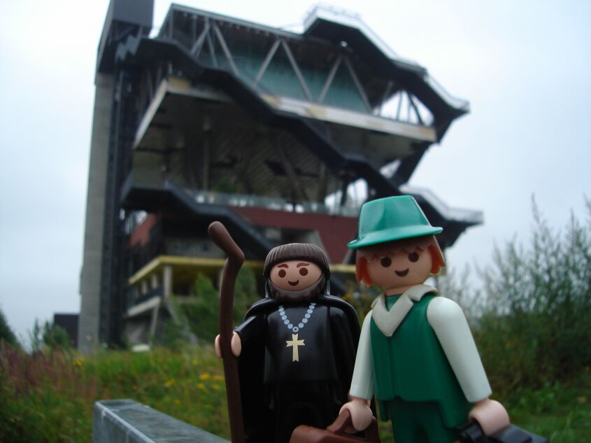 zu erklimmen, haben wir uns von weitem vor diesem Kronsberg, wie er offiziell heißt, fotografieren lassen. Ach ja, falls ihr es nicht erkennen könnt - die Kamera von Bruder Tuck ist scheinbar so alt wie sein Kloster - der Berg befindet sich auf dem Foto zwischen uns beiden. Das bißchen "Grün" auf dem Berg sind nicht nur Bäume, wie Bruder Tuck mir erklärte. Eines der Gebilde ist tatsächlich ein Gipfelkreuz, welches auf diesem 118m über dem Meeresspiegel hohen Berg nach der Besteigung durch Reinhold Messner anlässlich der EXPO aufgestellt wurde. Noch höher mit 122m ist in Hannover lediglich der Monte Müllo, es handelt sich um die Mülldeponie der Hannoveraner.