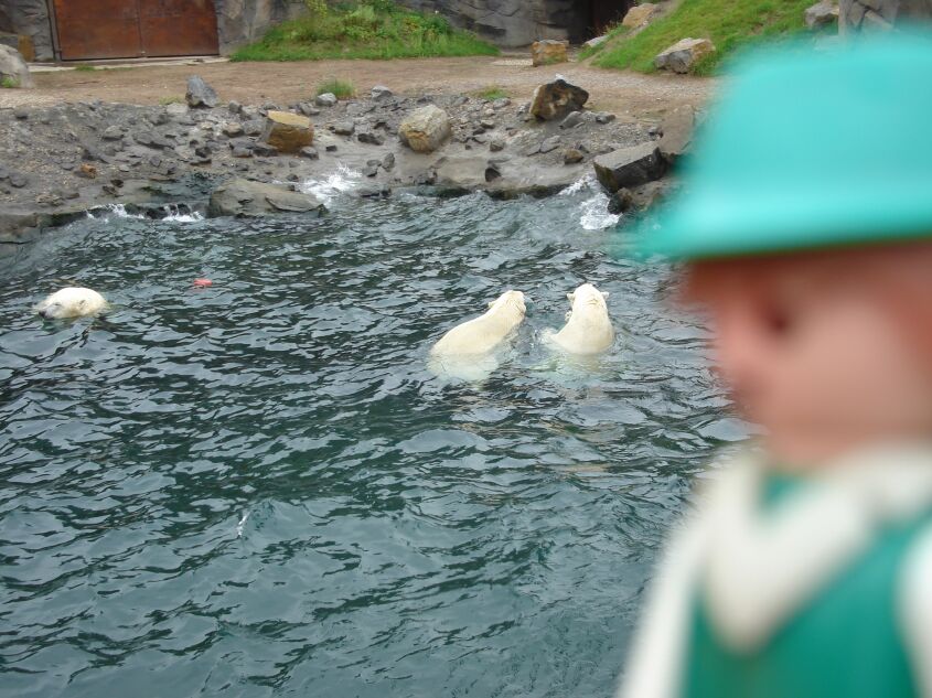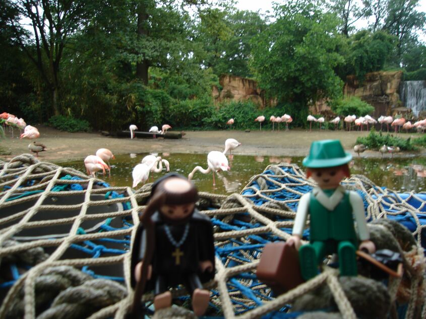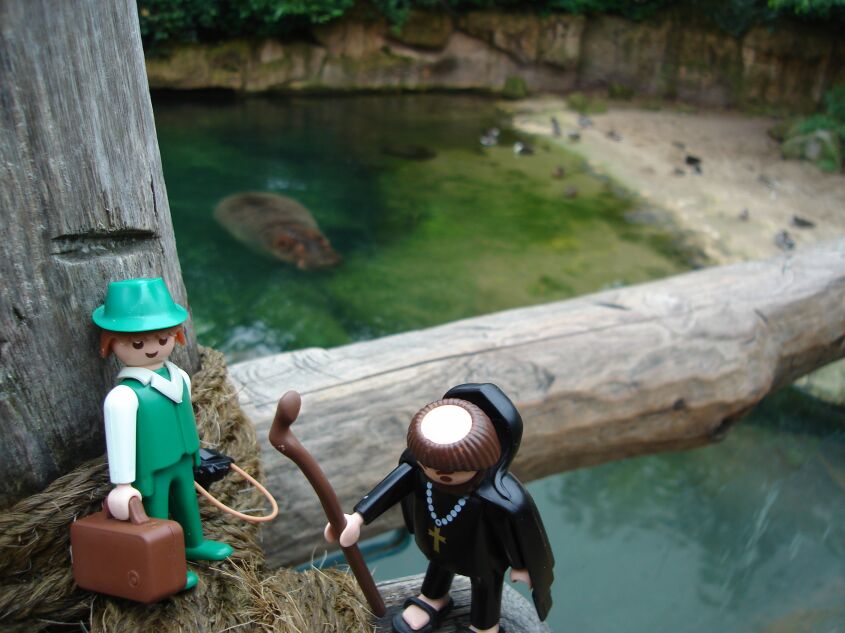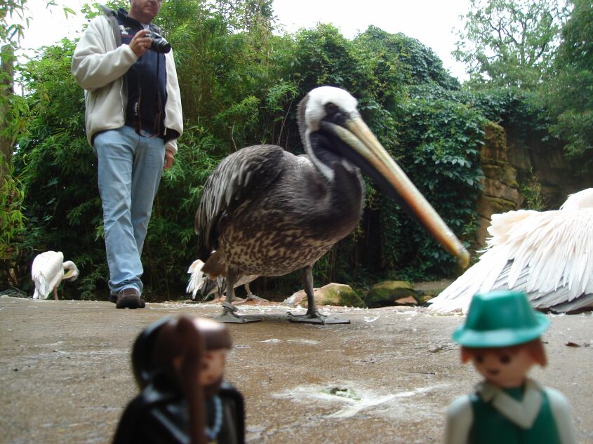 "Ganz einfach", entgegnete Bruder Tuck, "wir fahren zum ERLEBNISZOO HANNOVER!" Gesagt getan, kurze Zeit später musste ich schon um mein Leben fürchten! Da wollten wir uns mal eben in sicherem Abstand vor ein paar Pelikanen, die wohl nur so taten als würden sie dösen, ablichten lassen, als einer dieser gigantisch großen Vögel riesigen Schrittes mit seinen Flossenfüßen auf uns zukam und uns zu verschlingen drohte. Mit einem Sprung ins Gebüsch konnten wir uns gerade noch so retten. Fix und fertig haben wir uns ersteinmal - und dieses Mal wirklich in sicherem Abstand! - bei den Flusspferden von diesem Schock erholt.