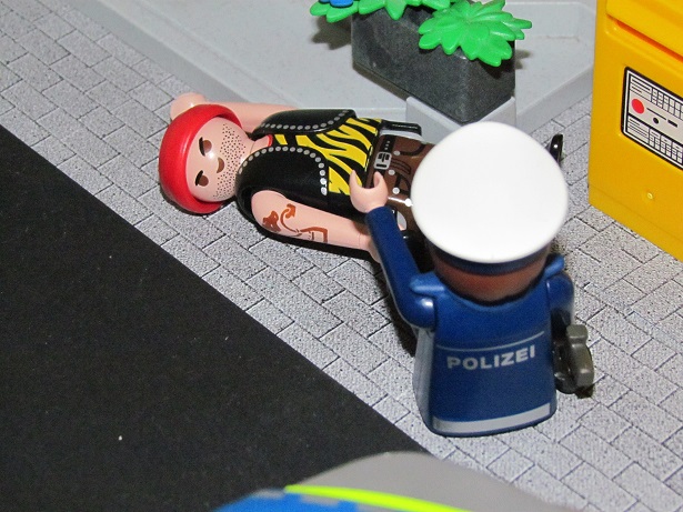 Polizistzin: "Stopp, das machen wir lieber auf der Wache. Sie kommen mit, okay?"