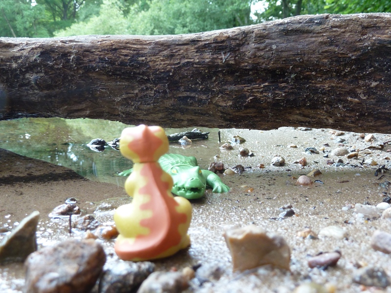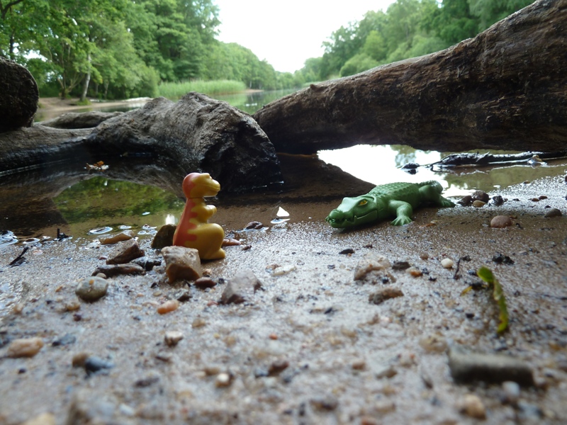 Da sieht er ein grünes Tier am Uferrand liegen. Ob das Krokodil vielleicht seine Brüder gesehen hat und ihm Auskunft gibt? Es ist auf jeden Fall kleiner und wird ihn nicht so schnell übersehen wie das Mammut.