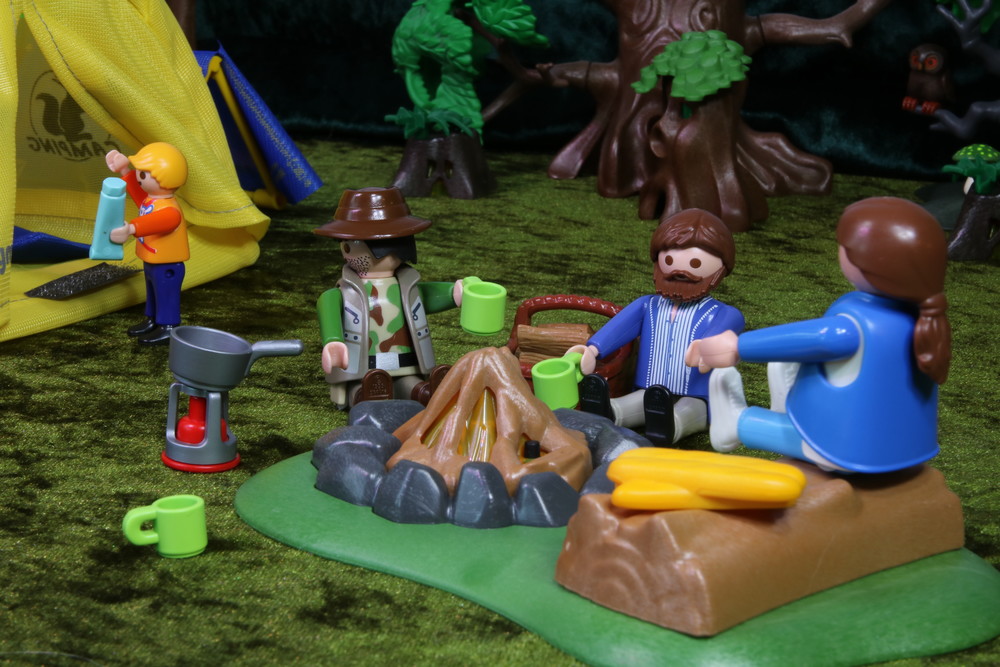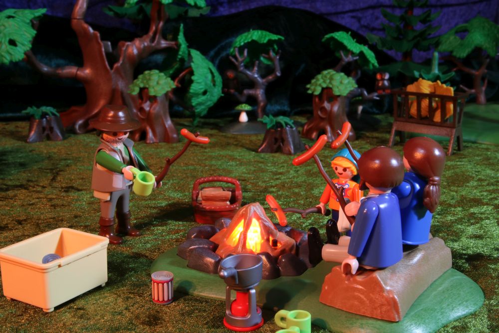 Nach getaner Arbeit sitzen alle gemütlich um das flackernde Lagerfeuer herum. Auf Stöcken haben sie Würstchen gesteckt, die sie über dem Feuer grillen.