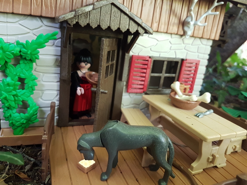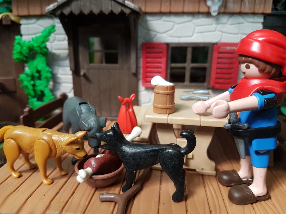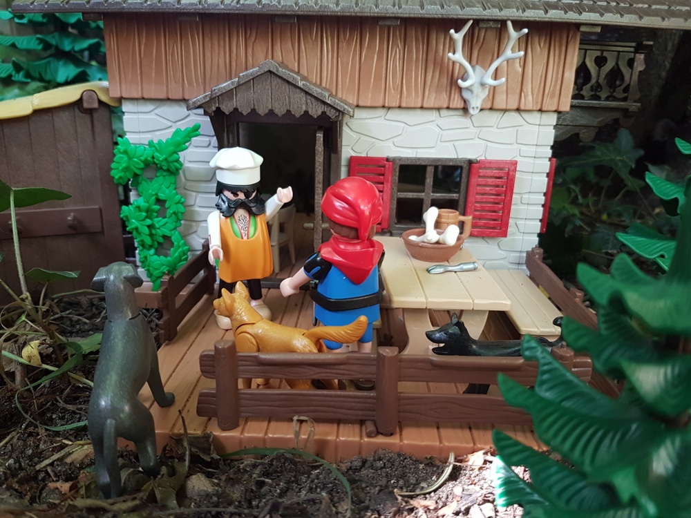 Während Jörg mit dem Wirt in das Gasthaus trat, lockte die Wirtin den Reißebeiß mit einem Schmalzbrot.