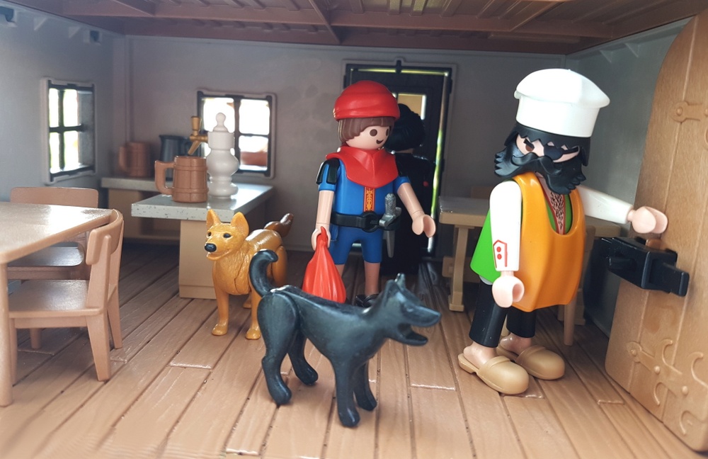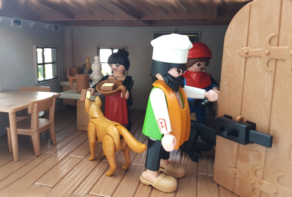 Und während Jörg den Raum betrat, lockte die Wirtin auch den Packan mit einem Schmalzbrot von seinem Herrn weg.