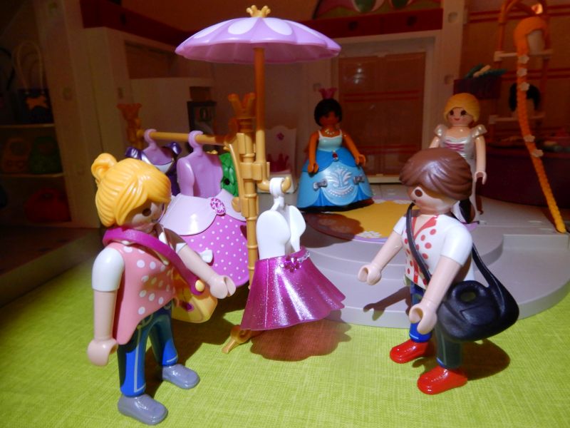 "Also das lila Kleid nehme ich - aber bei dem rosa Rock bin ich mir noch unsicher", entgegne ich. "Rosa ist nicht ganz das, was ich mir vorgestellt habe."