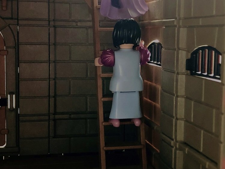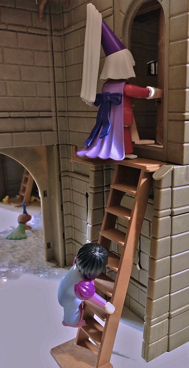Je höher sie kamen, desto lauter wurde es. Beinahe klang es jetzt nach Gejammere. - „Huhuhu, Huhuhu!“- Fredeswind öffnete die Luke zur Turmplattform, ein warmer Lichtstrahl erhellte zusätzlich den Raum. Sie sah sich gründlich um. Doch auch im Schlafzimmer, - nichts-! - „Huhuhu, Huhuhu!“- „Aber es gibt keine Gespenster!“, machten sie sich wieder gegenseitig Mut. Sie kletterten die letzte Leiter hoch, Fredeswind vorweg.
