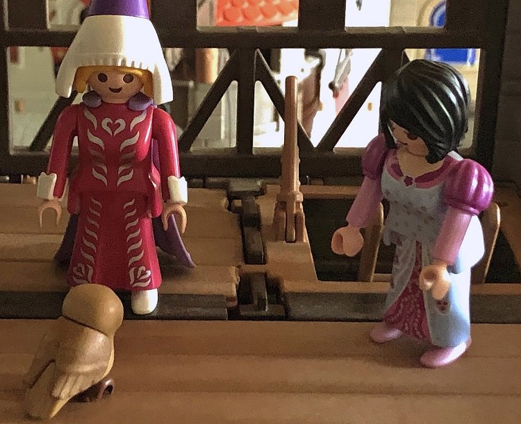 Nach einem kleinen Stallrundgang blieb Dietwana zum Melken im Stall, während wir wieder nach draußen gingen. Ich schaute mich neugiereig um und fragte Fredeswind:" Wer wohnt denn in den oberen Stockwerken?" Fredeswind antwortete: "Über der Schmiede wohnt Einhard mit Familie und über dem Stall wohnt ein Großteil der Ritter, das ist die Burgwache.Und rechts neben der Schmiede wohnt der Jäger.“ Ich sagte aufgeregt: "Er hat doch den Uhu, wie geht es ihm wohl? Da schaue ich doch gleich mal vorbei." Fredeswind antwortete: "Ich komme mit, das interessiert mich auch!" Der Jäger war erstaunt uns beide zu sehen. Er wusste aber sofort, weshalb wir da waren.