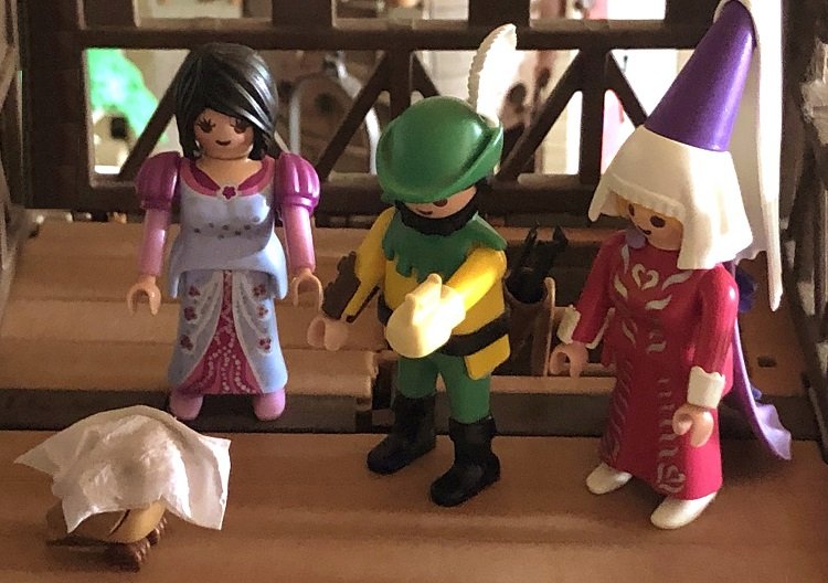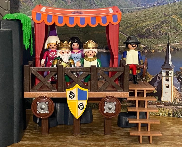 Mit einer lauten Fanfare eröffneten die Trompeter schließlich gekonnt die Ritterspiele. Zuerst durften die Gastgeber antreten. Die beiden Zwerge Pippin und Richwin ritten mit ihren kleinen Pferden aufeinander zu und versuchten sich mehrmals gegenseitig aus dem Sattel zu stoßen. Schließlich gelang es Richwin den Gegner zu treffen, der verlor seine Lanze. Nach den Regeln eines Turniers hätte jetzt der Schwertkampf folgen müssen. Das war aber bei einem Schaukampf hier nicht üblich und Richwin wurde zum Sieger ernannt.