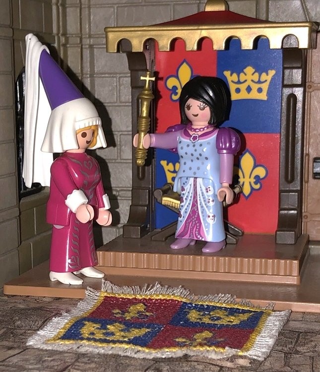 Dann erst hatte sie Zeit sich genauer umzuschauen. Der Thronsaal war ausgesprochen schlicht gehalten. Darüber war Fanny sehr erstaunt, sie hatte sich einen Thronsaal prächtiger vorgestellt. Das wertvollste schien hier, nach ihrem Ermessen, der Teppich zu sein. Die ausgesprochen schönen Teppiche in der Burg waren ihr schon die ganze Zeit aufgefallen, egal ob in der Kemenate mit dem Schlafzimmer oder dem Burgfried. Fanny erkundigte sich: „Sag mal, diese wundervollen Teppiche hier in deiner Burg, wer knüpft diese denn?“ Fredeswind antwortete: „Rabigaud, unser Händler hat da Beziehungen, er braucht bloß einen Entwurf, den er dann ausführen lässt. Die Entwürfe sind übrigens von mir, nach alten Wappen oder Mustern.“ Fanny staunte nicht schlecht.