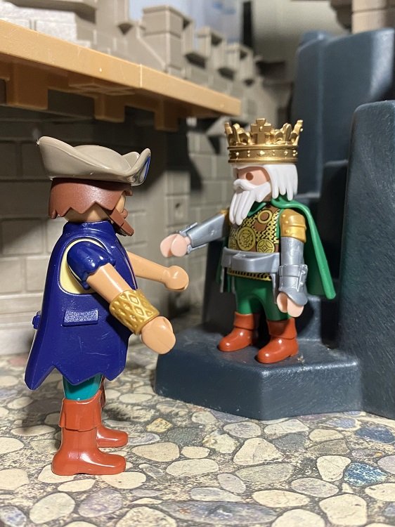 Drei Tage später kam Sausewind auf der Burg Adlerhorst an. Auch hier wurde er jedes Mal in der Burg verköstigt und seine stolzen und kräftigen Kaltblutpferde bekamen bestes Heu und Hafer vorgesetzt. Alsbald hatte Fredeswind erfahren, dass Rabigaud wieder da sei, er eine Nachricht für sie habe und so bat sie den Händler in den Thronsaal. Die Königin begrüßte ihn gespannt: „Seid gegrüßt werter Rabigaud, ich freue mich Euch hier zu sehen.“ Er dienerte und antwortete charmant: „Holde Königin, seid auch gegrüßt, ich freue mich in Euren Mauern weilen zu dürfen.“ Ohne Umschweife kam Sausewind dann gleich zur Sache: „Ich überbringe Euch eine Botschaft von König Alberich II. von Schwarzenfels mit folgendem Wortlaut: ‚Verehrte Königin Fredeswind von Adlerhorst, ich möchte Euch und euren Besuch Fanny aus der anderen Welt herzlich nach Schwarzenfels einladen. Zu Ehren Eures Gastes veranstalten wir, am nächsten Vollmondtage, Ritterspiele auf der großen Wiese vor der Burg Schwarzenfels.‘ So lautet dieMitteilung für Euch.“ Fredeswind dankte dem Boten gebührend, wünschte ihm eine gute Weiterreise und verabschiedete ihn freundlich.