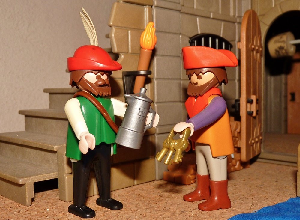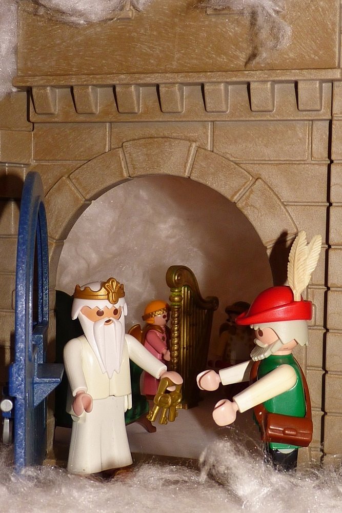Nun gab ihm der Wirt die Schlüssel und Essen und Trinken, und damit ging der Bruder Lustig ins Schloss.