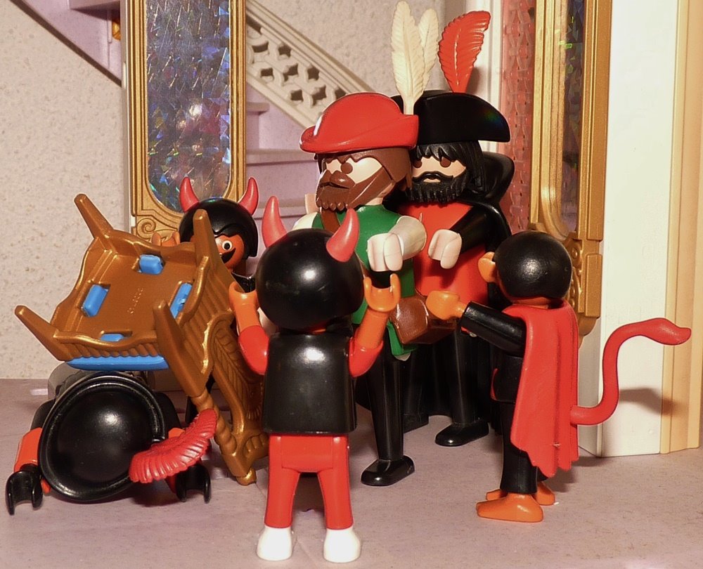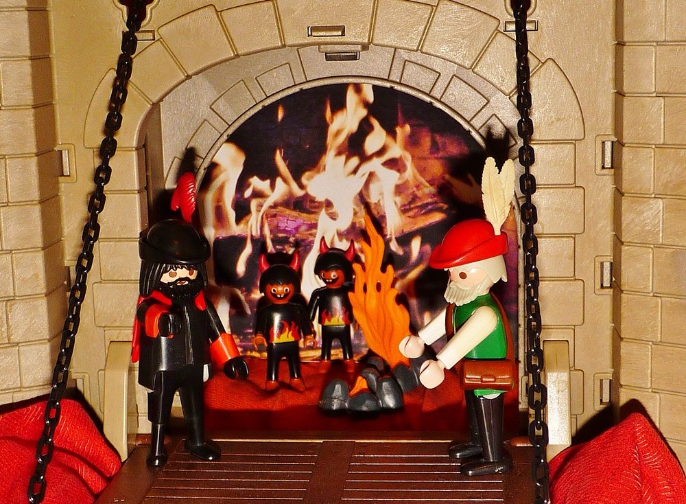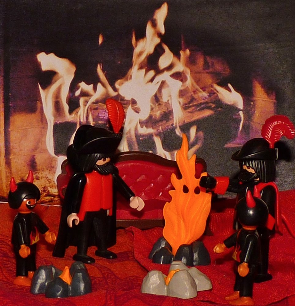 Und wie er sich ermunterte, sah er hässliche Teufel in dem Zimmer, die hatten einen Kreis um ihn gemacht und tanzten um ihn herum.