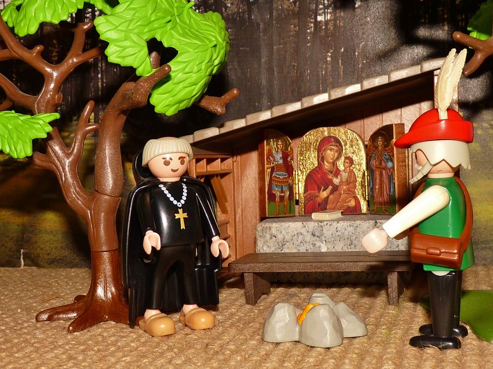 Endlich aber wurde er alt und dachte an sein Ende, da ging er zu einem Einsiedler, der als ein frommer Mann bekannt war, und sprach zu ihm: „Ich bin das Wandern müde und will nun trachten, in das Himmelreich zu kommen.“ Der Einsiedler antwortete: „Es gibt zwei Wege, der eine ist breit und angenehm und führt zur Hölle, der andere ist eng und rau und führt zum Himmel.“