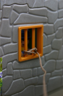 Aufeinmal fällt ein Ende eines Seils durch das Gitterfenster...