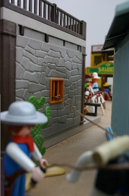 Rick hat das Ende am Sattelknauf seines Pferdes befestigt. Er läßt den Gaul einige Schritte nach vorne tun. Das Seil spannt sich...