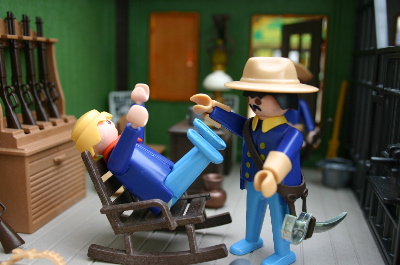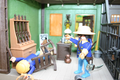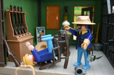 Den eintretenden Sheriff beachtet er gar nicht, sondern schiebt einen anderen Soldaten beiseite und geht Richtung Tür....