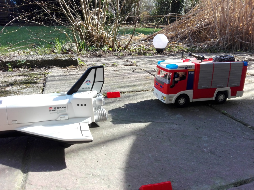 Schließlich nähert sich ein Feuerwehrauto dem Shuttle, um auf alle Eventualitäten vorbereitet zu sein.