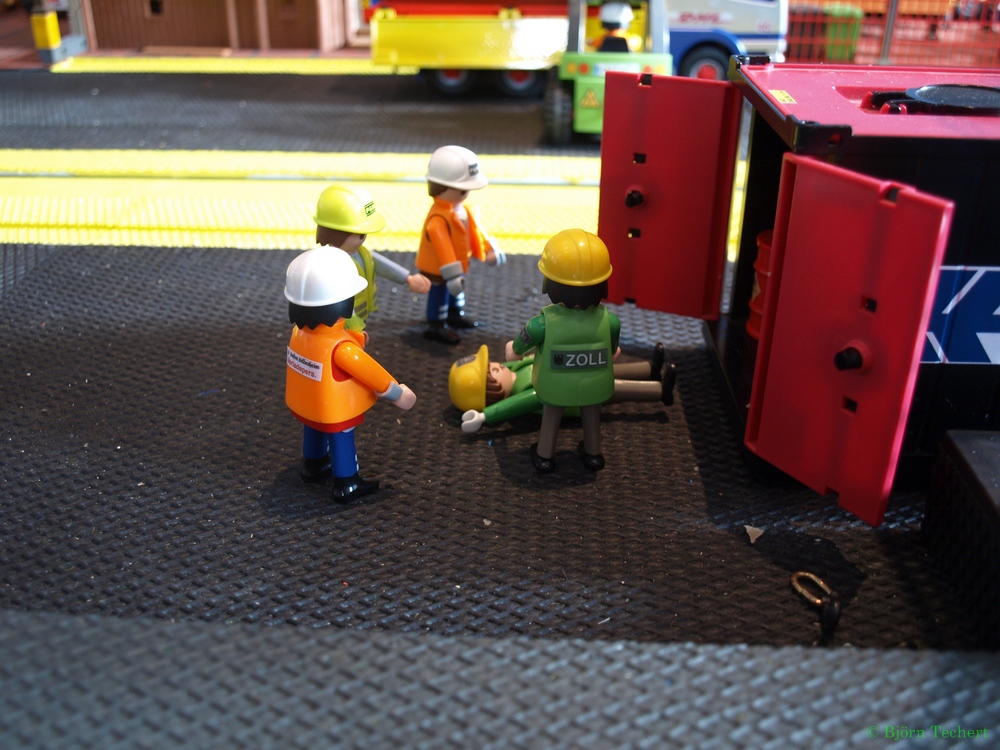 Helmut ruft in der Leitstelle an und fordert den Zoll und den LKW der Feuerwehr an.