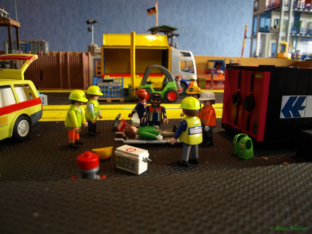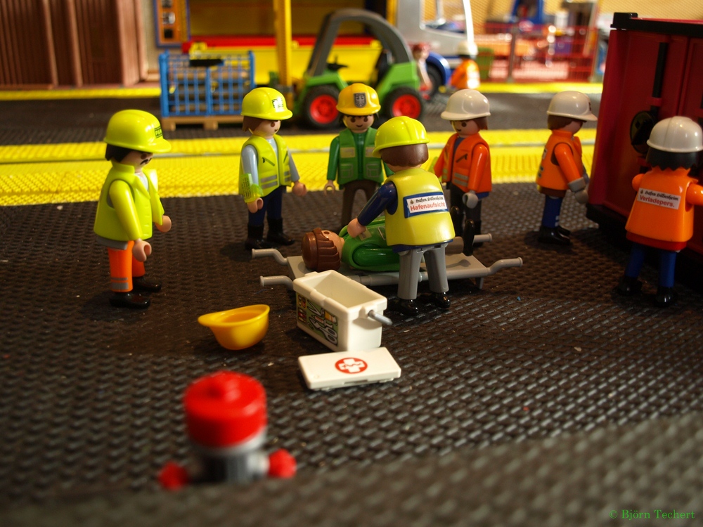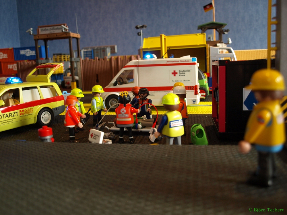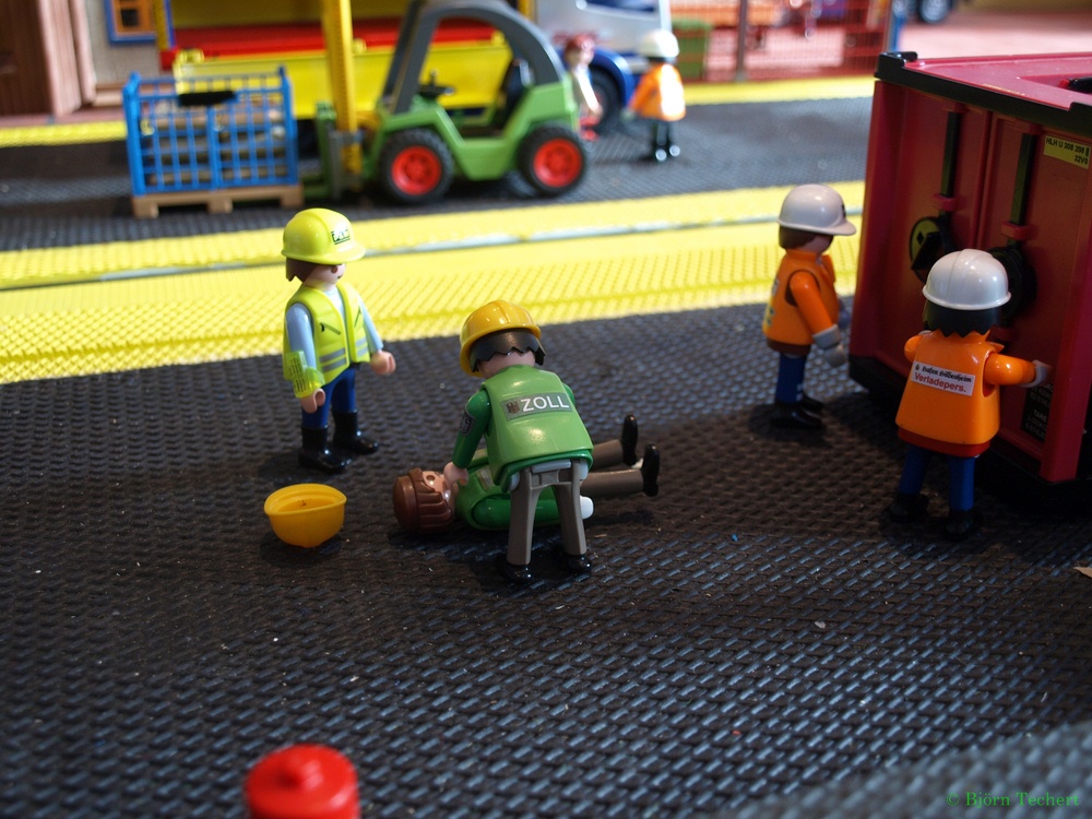 "Herr Bäcker, wir sind soweit fertig. Der Hafen ist wieder freigegeben. Der Container wird noch von einem Tieflader abgeholt." sagt Helmut.