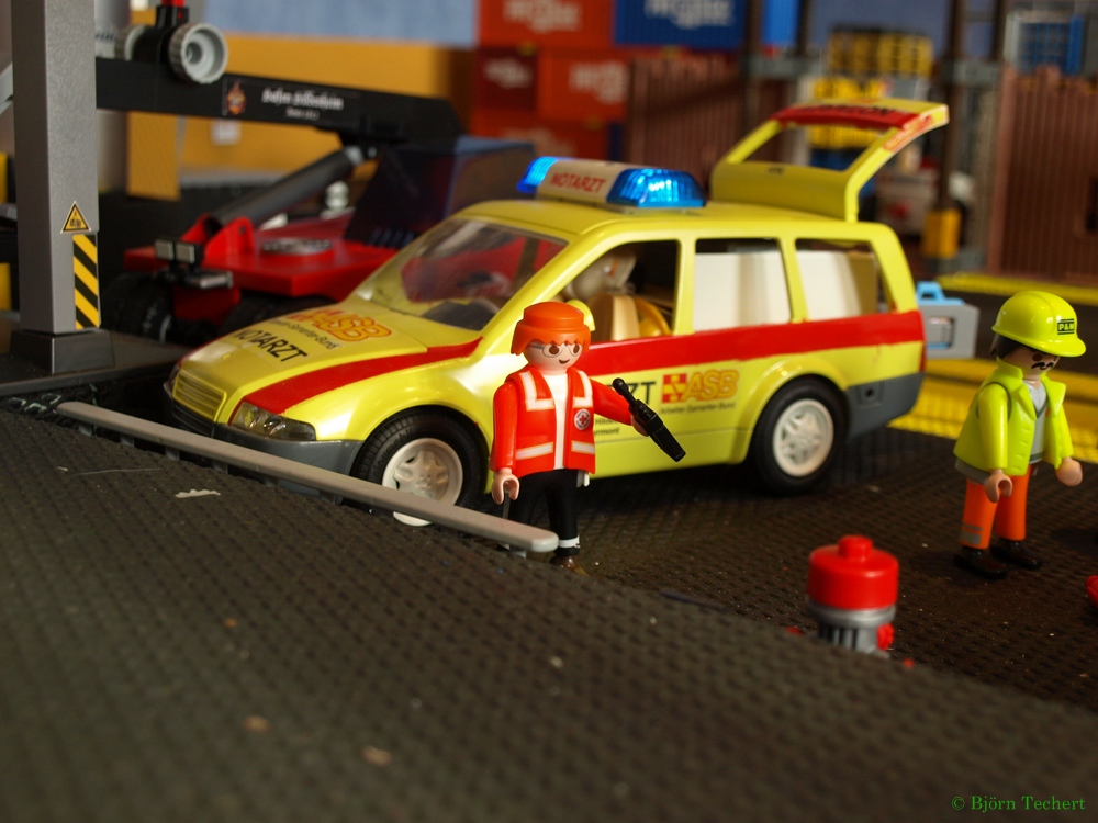 Mit Blaulicht und Martinshorn rückt der Notarzt auf das Gelände.