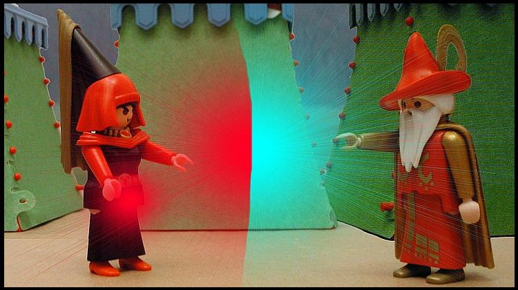 Meister Merveil hatte inzwischen ebenfalls sein Ziel erreicht. Im gleichen Moment als die Hexe den sterbenden Jorad verlassen wollte, stellte der alte Meistermagier sich ihr in den Weg. „Bleib‘ stehen, Hexe!“ Geschwächt von der vorangegangenen Auseinandersetzung gehorchte die Hexe. Sie spürte die starke magische Ausstrahlung, die von Merveil ausging, und beugte sich seiner Präsens. Ein heftiger Zweikampf entbrannte. Immer wieder prallten die magischen Energien der Kontrahenten aufeinander. Keiner der beiden wich auch nur um einen Zentimeter.