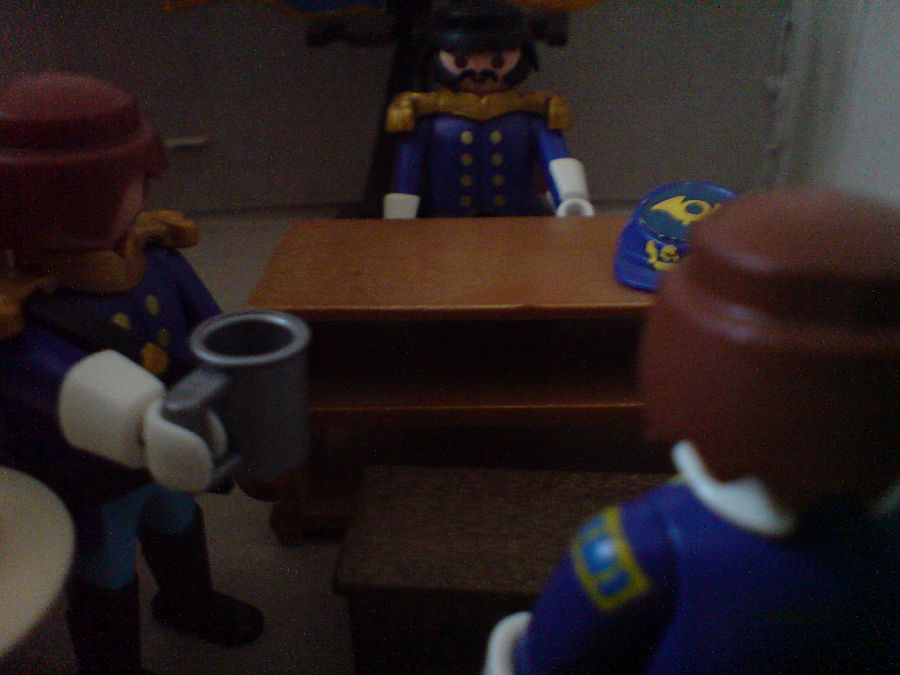 "Hey Leutnant? Wo ist den jetzt ihre Mütze? Was ist denn mit ihrem Gesicht passiert? Hat ihr Regattateam verloren?" "Ich,... bitte begleiten sie mich ein Stück. Ich habe was zu erzählen."