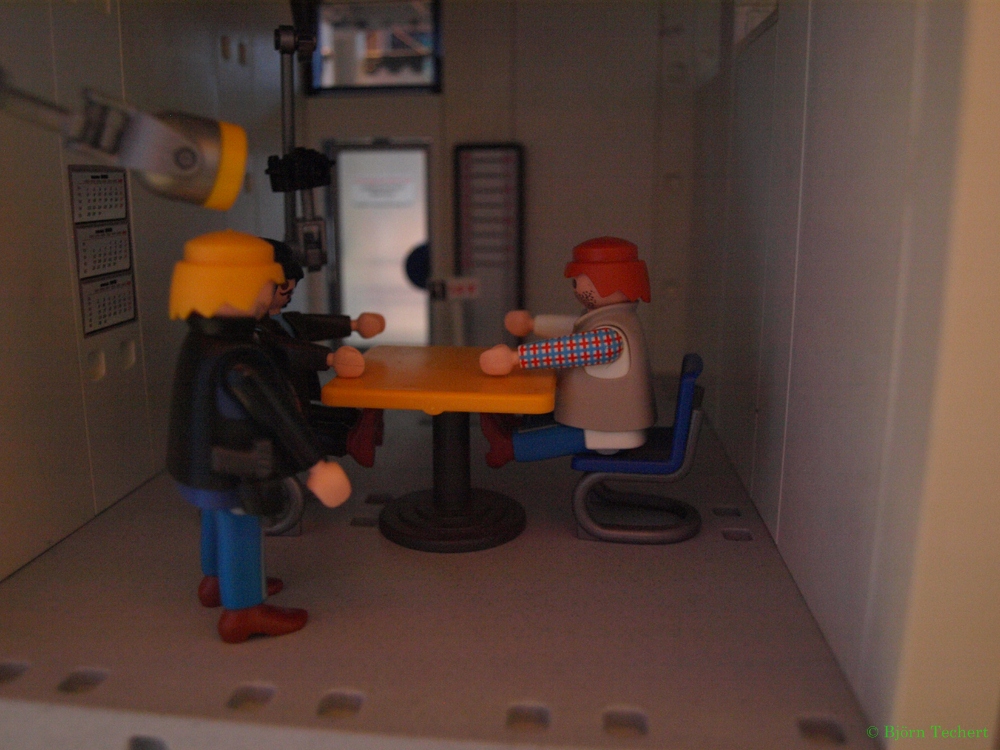Im Verhörraum wird ein Mann gebracht.