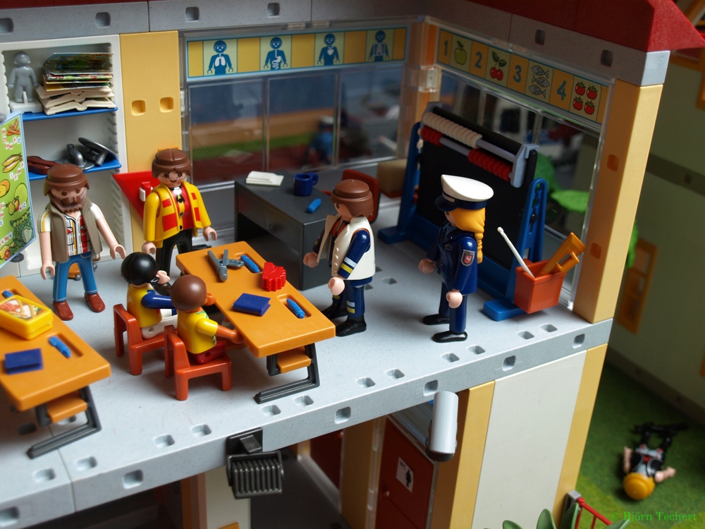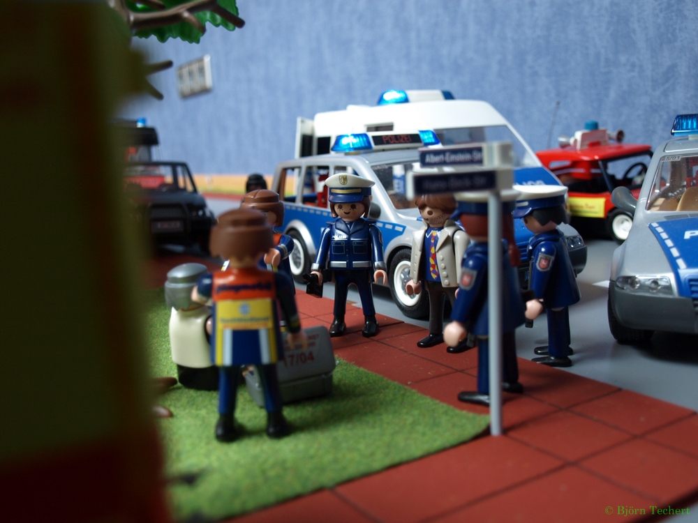 "Hier ist Herr Müller von der Albert Einstein Grundschule. Auf dem Grundstück neben an wird geschossen. Es klingt nach schweren Waffen! Kommen sie schnell!"