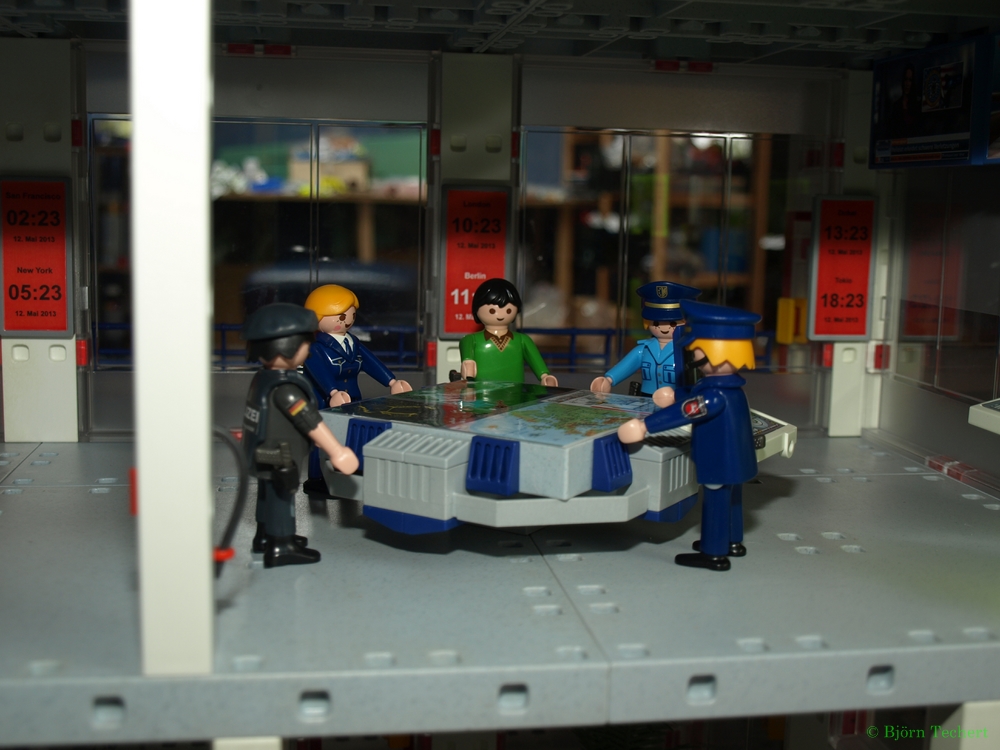 Im neuen Lagezentrum haben sich der neue Landespolizeidirektor Prof. Dr. Björn "Tigger" Einstein, die Leiterin der Bundespolizeidirektion Polizeidirektorin Sarina Kunze, Kriminaloberkommissar Jonas Rajer vom Bundeskriminalamt, Staatsanwältin Dr. Vivane Horn und der Einsatzleiter der GSP 9 der Bundespolizei (nennen wir ihn mal Wolfgang) zusammen gesetzt.