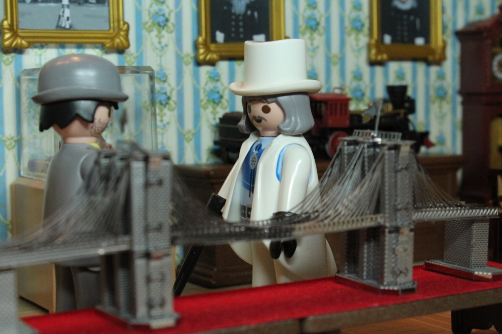 Sein Blick fiel sofort auf das große Modell der Brooklyn Bridge, welches in der Mitte des Raumes stand.