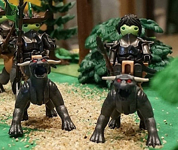 Jedoch, kaum wieder auf dem Weg, hielten sie ein paar grünhäutige Orks auf ihren bedrohlich wirkenden rotäugigen Reittieren auf. Die Freundinnen blieben wie angewurzelt stehen. Da ertönte eine tiefe sonore Stimme: „Haben gehört, brauchen Hilfe, bringen euch zu Wölfe.“ Langsam löste sich die Erstarrung der beiden Frauen. Anscheinend waren die Herrschaften in friedlicher Stimmung. Mit zittriger Stimme wisperte Fanny Fredeswind zu: „Haben die gerade angeboten uns zu Anuk und Kuna zu bringen?“ „Das klang so.“, brachte Fredeswind mühsam hervor. „Bringen euch zu Wölfe!“, wiederholte die Stimme eindringlicher.