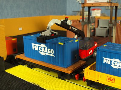Die 20' und 10' Container werden mit dem Reach Stacker vom Zug genommen.