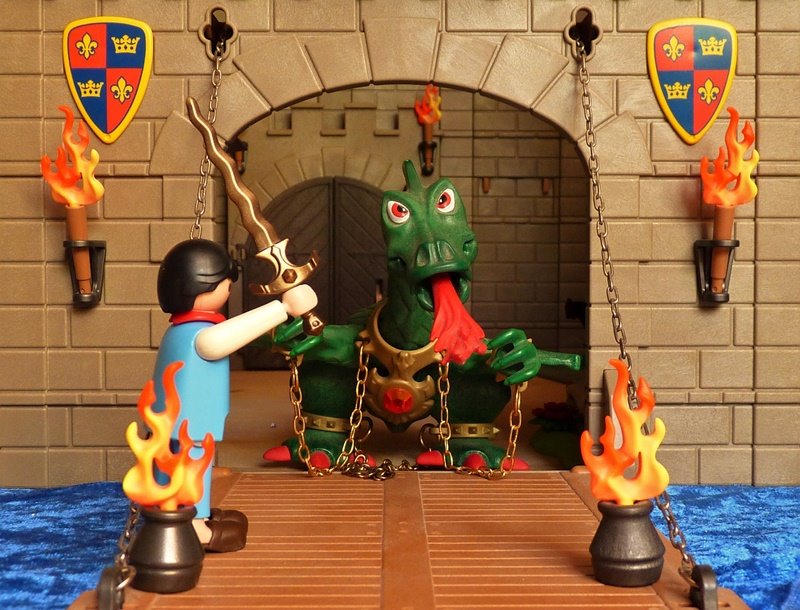 Der Junge überlegte nicht lange, sondern zog gleich wieder los. Er kam zum ersten Tor des Teufelsschlosses, und dort stand ein Drache Wacht, aus dessen Mund Feuer und Rauch kam. Der Junge schlug dem Drachen mit seinem Schwert den Kopf ab.