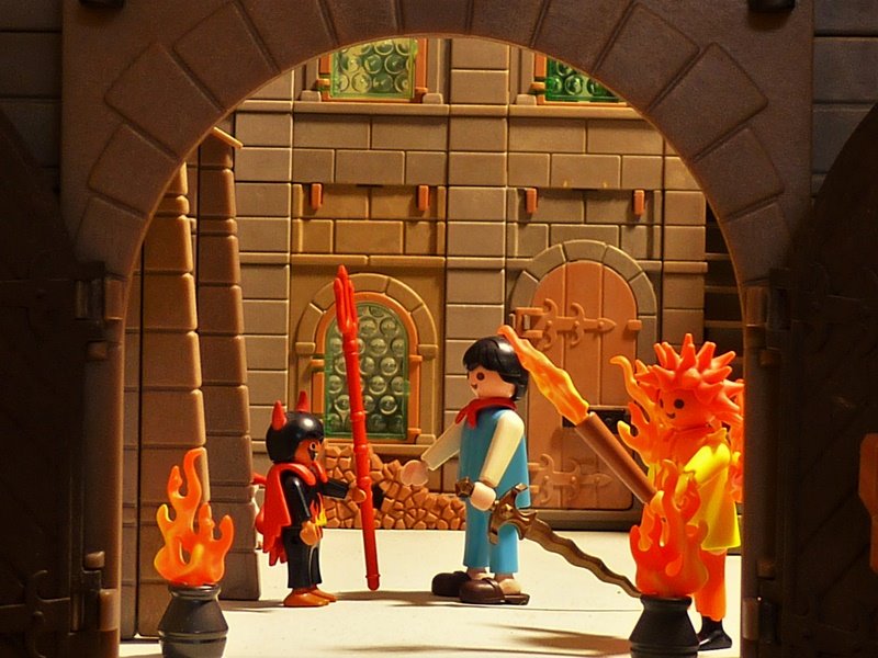 Dann ging zum zweiten Tor, denn das Teufelsschloss war von drei Steinmauern umgeben, und dort befand sich wieder ein Drache wie am ersten Tor. Der Junge tötete auch diesen und ging zum dritten Tor, wo wieder ein Drache Wacht hielt, und auch den tötete der Junge und gelangte so ins Innere des Schlosses und fragte, ob der Hausherr da sei.