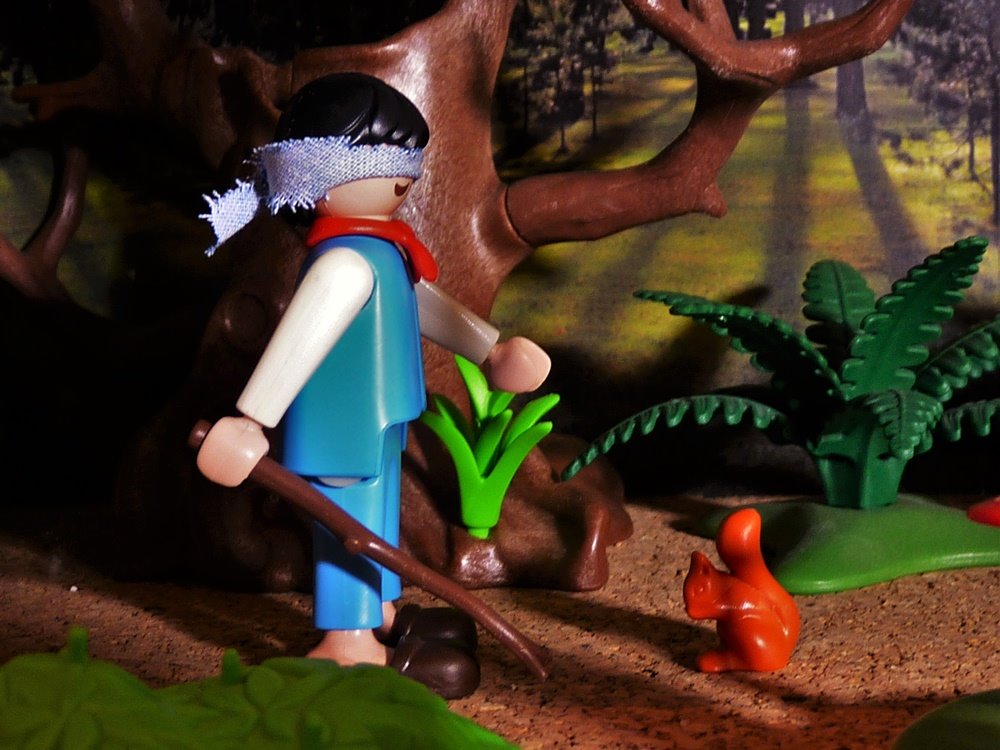 Der Junge wanderte im Wald umher, voller Trauer darüber, dass er sein Augenlicht verloren hatte und sich nun auch nichts mehr zu essen besorgen konnte, da er nichts mehr sah. Er zog kreuz und quer durch den Wald. Da kam ihm ein Eichhörnchen entgegen.