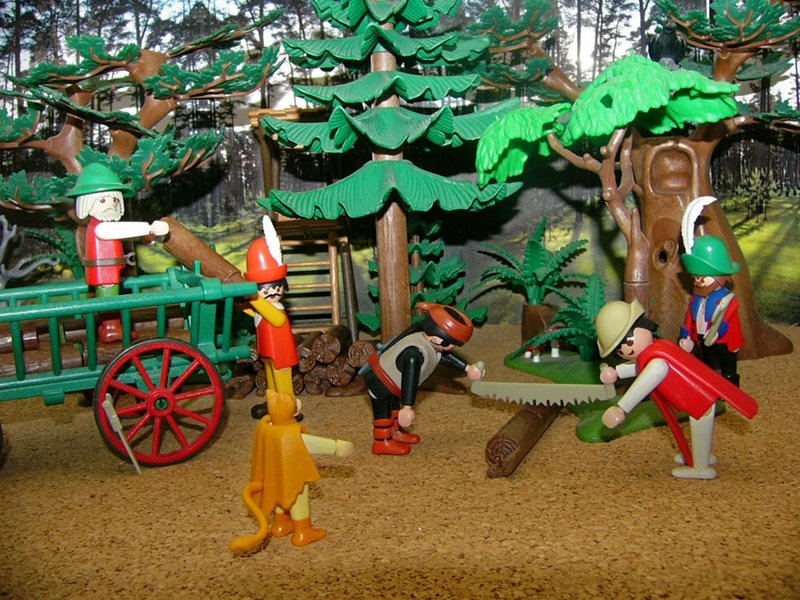 Endlich kam der Kater in einen prächtigen Wald, in dem dreihundert Leute Bäume fällten und Holz machten. „Wem gehört dieser Wald?“, fragte der Kater. „Dem großen Zauberer“, antworteten die Leute. „Passt gut auf, Leute“, sagte der Kater. „Gleich wird der König vorbeifahren, und wenn er fragt, wem dieser Wald gehört, dann antwortet: dem Grafen von Carrabas. Wenn ihr das nicht tut, werdet ihr alle totgeschlagen.“ Dann ging der Kater weiter, und die Leute sahen ihm nach und hatten Angst vor ihm, weil er so seltsam aussah und wie ein Mensch in Stiefeln auf zwei Beinen ging.