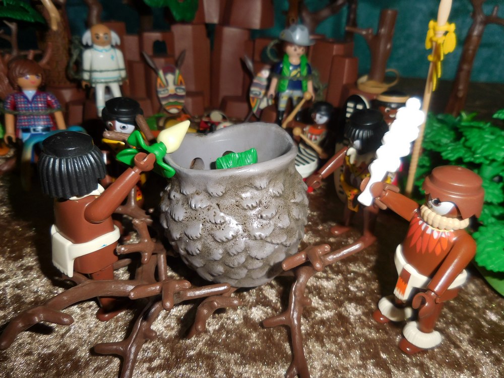 Nun rollen sie einen großen Topf herbei, stellen ihn auf