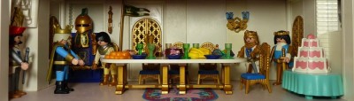 Ihnen folgten des Herzogs Herold und dreihundert Ritter, die im Namen des Herzogs den König zu einem großen Gastmahl in das neue Schloss einladen sollten. Der König wunderte sich sehr über all die Pracht, die des Herzogs Gefolge zeigte, noch mehr aber über das, was ihm seine eigenen Leute von den Herrlichkeiten des Schlosses schilderten.