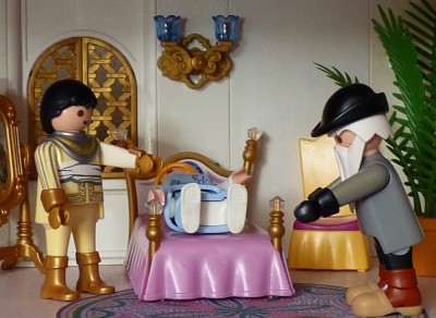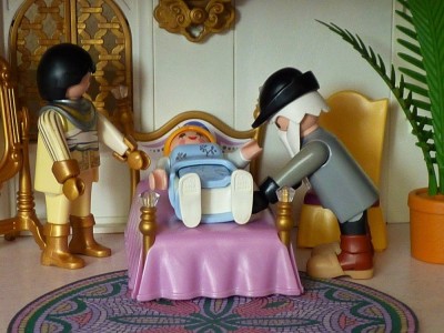 Als ein Jahr zu Ende gegangen war, gebar die Prinzessin dem Herzog einen Sohn, und jetzt herrschte Freude im ganzen Königreich, und das kann man wohl verstehen, denn der junge Prinz sollte ja dereinst das Königreich nach seinem Großvater erben. Alle Könige und Fürsten, Königinnen und Prinzessinnen weit im Umkreis wurden zu Gevatter gebeten, und der Herzog gab ein Gastmahl, dass keiner, der daran teilnahm, sich erinnern konnte, auch nur im Traum etwas Ähnliches gesehen zu haben.