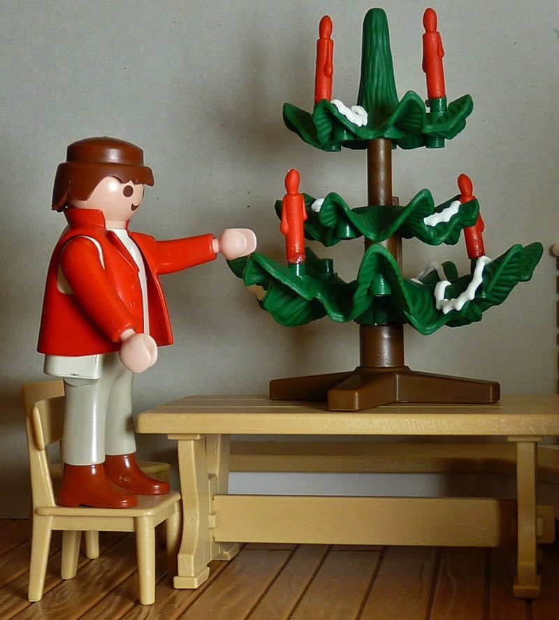 Dieweilen also die Leute alle draußen zu tun hatten, bereitete ich in der großen Stube den Christbaum. Das Bäumchen, das im Scheite stak, stellte ich auf den Tisch. Dann schnitt ich vom Wachsstock Kerzchen und klebte sie an die Ästlein. Das plagte ein wenig, denn etliche wollten nicht kleben und fielen herab. Ich hätte sehr gern Geduld gehabt, um alles ordentlich zu machen, aber jeden Augenblick konnte die Tür aufgehen und vorzeitig wer hereinkommen. Gerade diese zitternde Hast, mit der sie behandelt wurden, benützten die Kerzchen, um mich ein wenig zu necken.