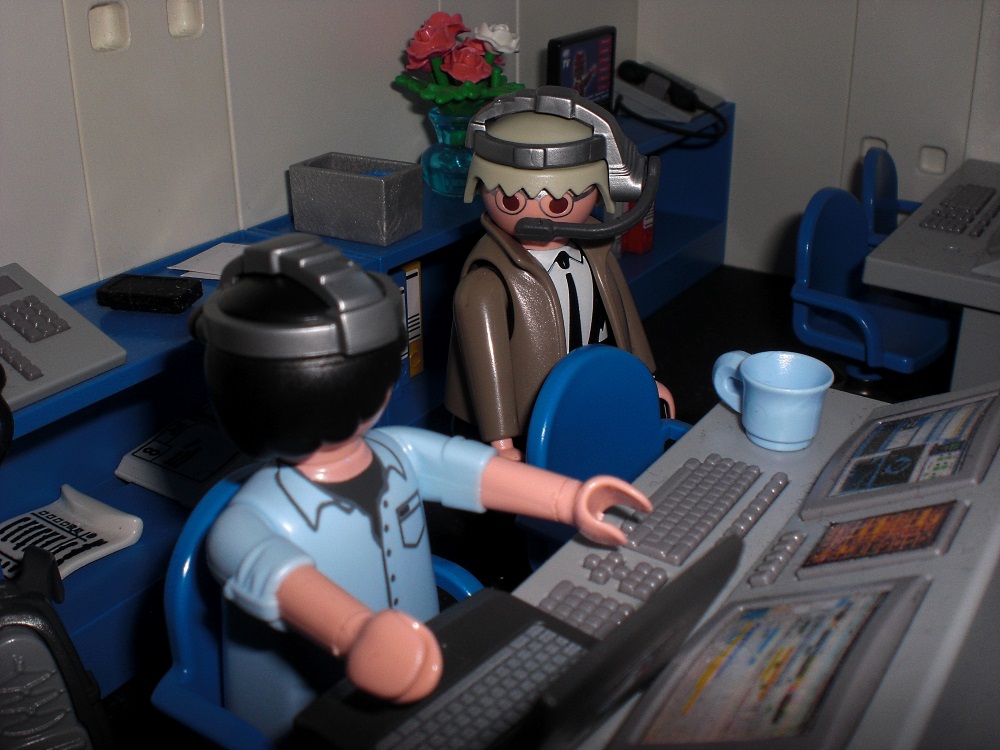 Sie werden von einem Mitarbeiter in den Kontrollraum gebracht.