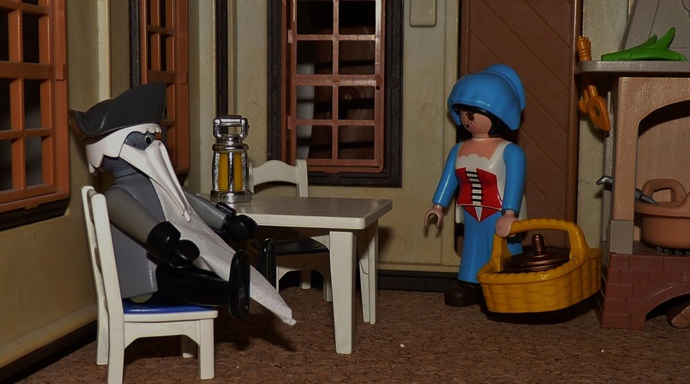 Das Mädchen fand in der Küche Überfluss an allem und kochte eine gute Speise, aber an die Tiere dachte es nicht. Es trug die volle Schüssel auf den Tisch, setzte sich zu dem grauen Mann, aß und stillte seinen Hunger.