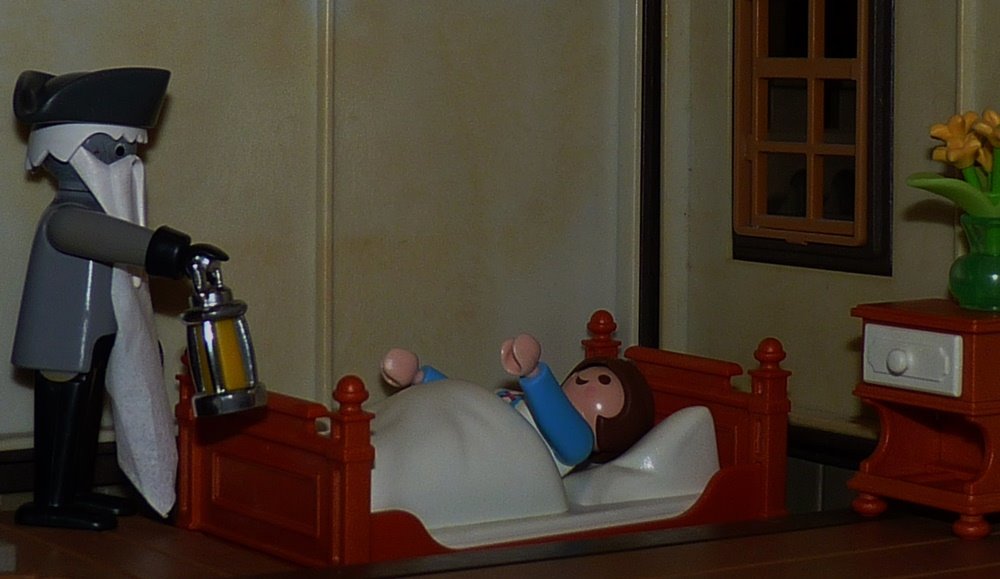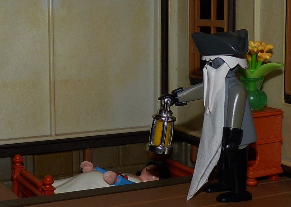 Nach einiger Zeit aber kam der graue Mann, beleuchtete das Mädchen mit dem Licht und schüttelte den Kopf. Und als er sah, dass es fest eingeschlafen war, öffnete er eine Falltüre und ließ es in den Keller sinken.