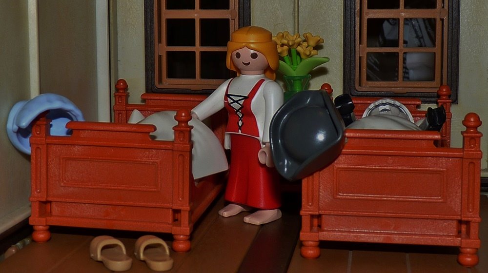 Da sprach der Alte: „Steig nur die Treppe hinauf, so wirst du eine Kammer mit zwei Betten finden, schüttle sie auf und decke sie mit weißem Linnen, so will ich auch kommen und mich schlafen legen.“