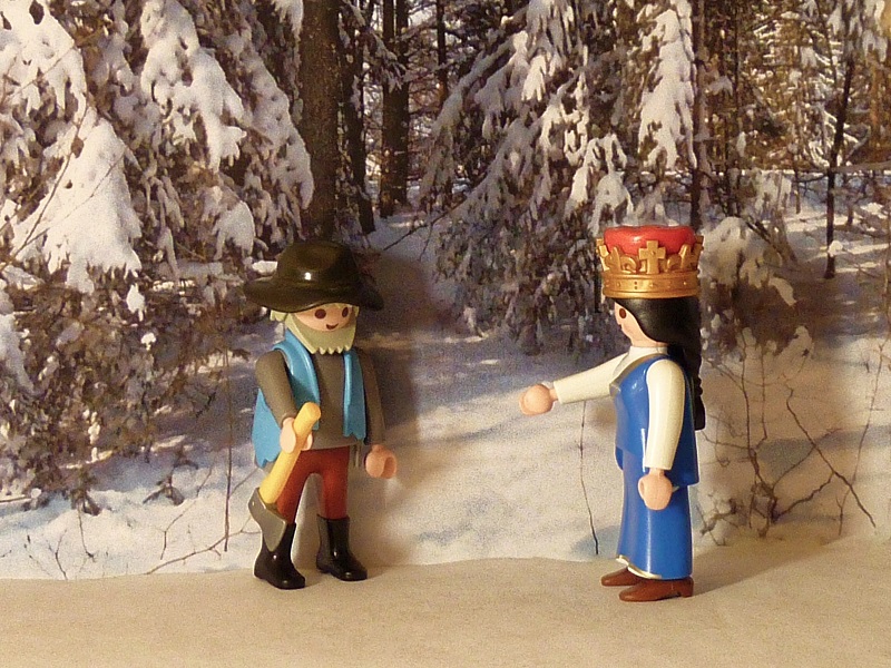 Eines Morgens ging der Holzhacker voller Sorgen hinaus in den Wald an seine Arbeit, und wie er da Holz hackte, stand auf einmal eine schöne große Frau vor ihm, die hatte eine Krone von leuchtenden Sternen auf dem Haupt und sprach zu ihm: „Ich bin die Jungfrau Maria, die Mutter des Christkindleins: du bist arm und dürftig, bring mir dein Kind, ich will es mit mir nehmen, seine Mutter sein und für es sorgen.“