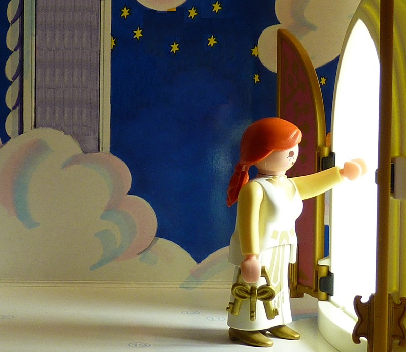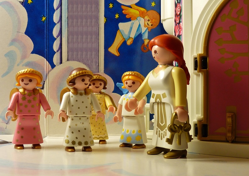 Und als nun die Jungfrau Maria weg war, fing sie an und besah die Wohnungen des Himmelreichs: jeden Tag schloss es eine auf, bis die zwölfe herum waren. In jeder aber war ein, von großem Glanz umgebener Apostel, und es freute sich über all die Pracht und Herrlichkeit, und die Englein, die es immer begleiteten, freuten sich mit ihm.